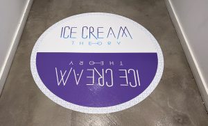 We expanded the brand identity to the digital menus on display in the shop as well as floor decals to bring the unique identity of Ice Cream Theory to life.